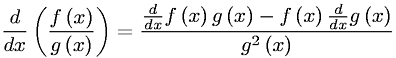 \frac{d}{{dx}}\left( {\frac{{f\left( x \right)}}{{g\left( x \right)}}} \right) = \frac{{\frac{d}{{dx}}f\left( x \right)g\left( x \right) - f\left( x \right)\frac{d}{{dx}}g\left( x \right)}}{{g^2 \left( x \right)}}